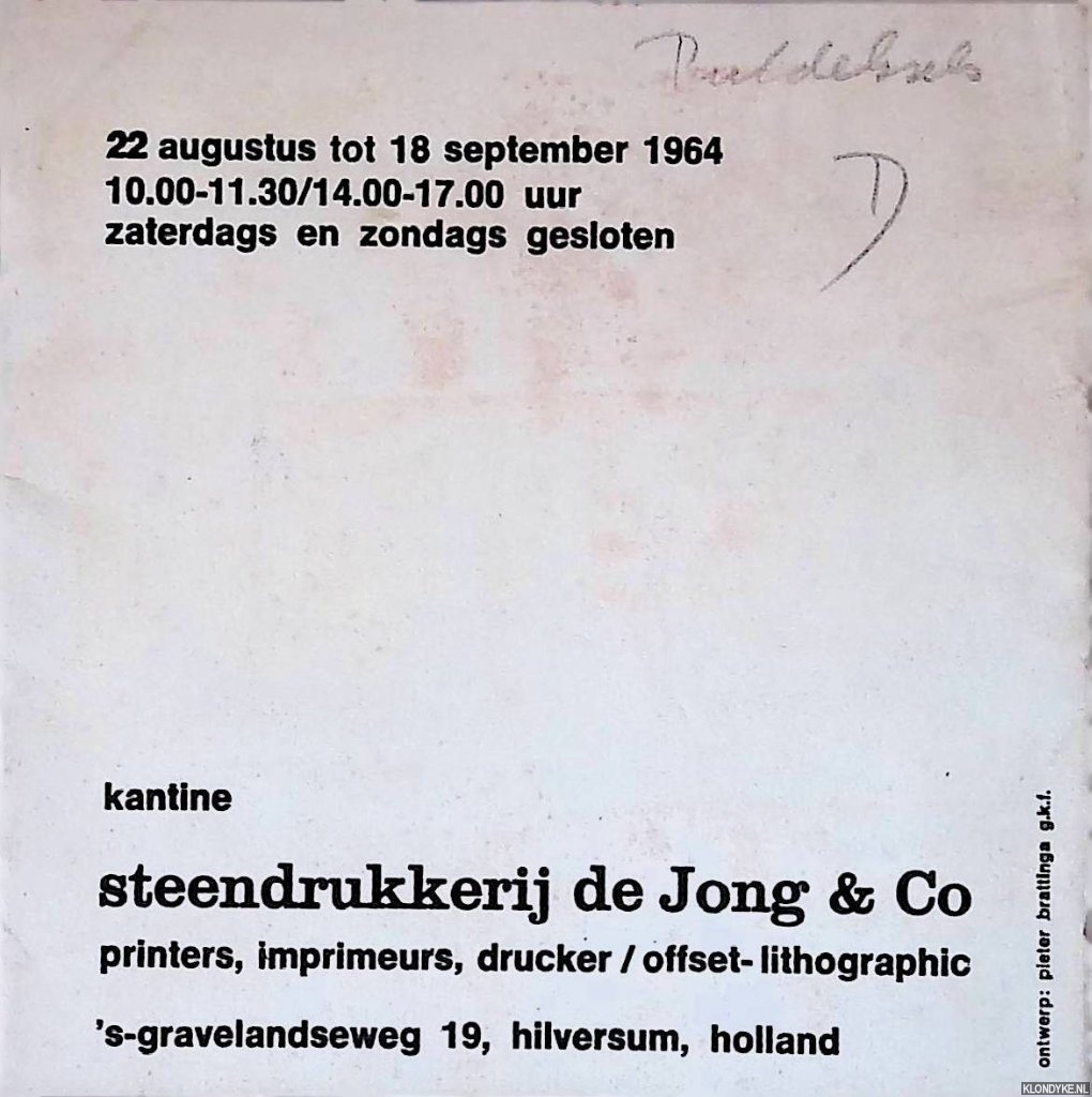| Beschrijving | Oorspronkelijk geniet omslag, softcover, enkele illustraties in z/w, tekst in het Nederlands, Engels, Frans en Duits, ongepagineerd, vierkant (circa 12x12cm). Met adressering en frankering. Tentoonstelling 61: 22 augustus tot 18 september 1964 kantine Steendrukkerij de Jong & Co. |