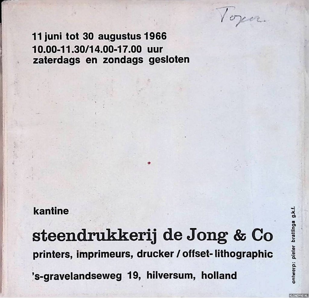 Beschrijving | Oorspronkelijk geniet omslag, softcover, veel (paginagrote) illustraties in z/w, tekst in het Nederlands, Engels, Frans en Duits, ongepagineerd, vierkant (circa 12x12cm). Met adressering en frankering. Tentoonstelling 67: 11 juni tot 30 augustus 1966 kantine Steendrukkerij de Jong & Co. |