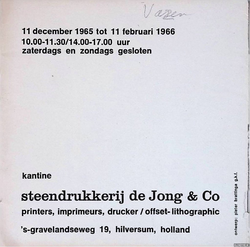 Beschrijving | Oorspronkelijk geniet omslag, softcover, veel (paginagrote) illustraties in z/w en kleur, tekst in het Nederlands, Engels, Frans en Duits, ongepagineerd, vierkant (circa 12x12cm). Met adressering en frankering. Tentoonstelling 65: 11 december 1965 tot 11 februri 1966 kantine Steendrukkerij de Jong & Co. |