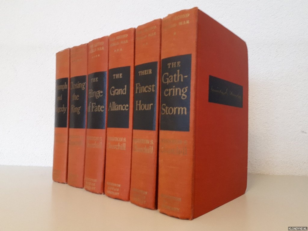 Beschrijving | 6 uniform red cloths 1948-1953, 784+751+903+1000+749+800 pages, uncut, partly unopened, 8vo. Volume 1) The Gathering Storm; Volume 2) Their Finest Hour; Volume 3) The Grand Alliance; Volume 4) The Hinge of Fate; Volume 5) Closing the Ring; Volume 6) Triumph and Tragedy. |
