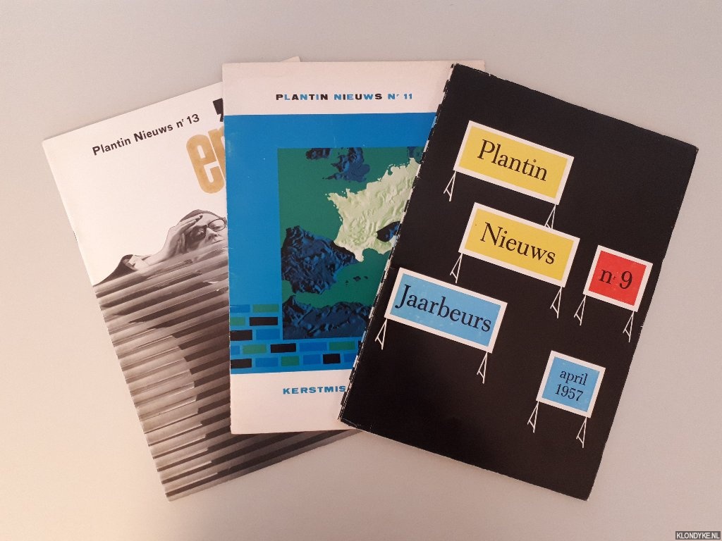Beschrijving | 3 afleveringen van Plantin Nieuws (2x geniet, 1x paperback), veel illustraties (waaronder foto's), 4to. Het gaat om de drie afleveringen: 1) tweede jaar: nummer 9 (april 1957); 2) nummer 11 (Kerstmis 1958); 3) nummer 13 (mei 1963). |