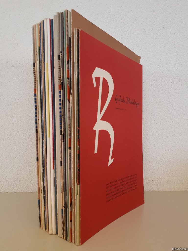 23 (geniete) afleveringen van Grafische Mededelingen, illustraties voornamelijk in z/w, (klein) 4to. Het gaat om de volgende afleveringen: 1) Negende jaargang 1951-1952: nummer 1, 3, 4, 6; 2) Elfde jaargang 1953-1954: nummer 2, 4, 5, 6; 3) Twaalfde jaargang 1954-1955: nummer 1, 2, januari '55; 4) Veertiende jaargang 1956-1957: nummer 1, 2, 3, 4; 5) Vijftiende jaargang 1957-1958: nummer 2, 3; 6) Zestiende jaargang 1959: nummer 1, 2; 7) Zeventiende jaargang: nummer 1, 2; 8) Achttiende jaargang: nummer 1, 2. + 2 doublures.