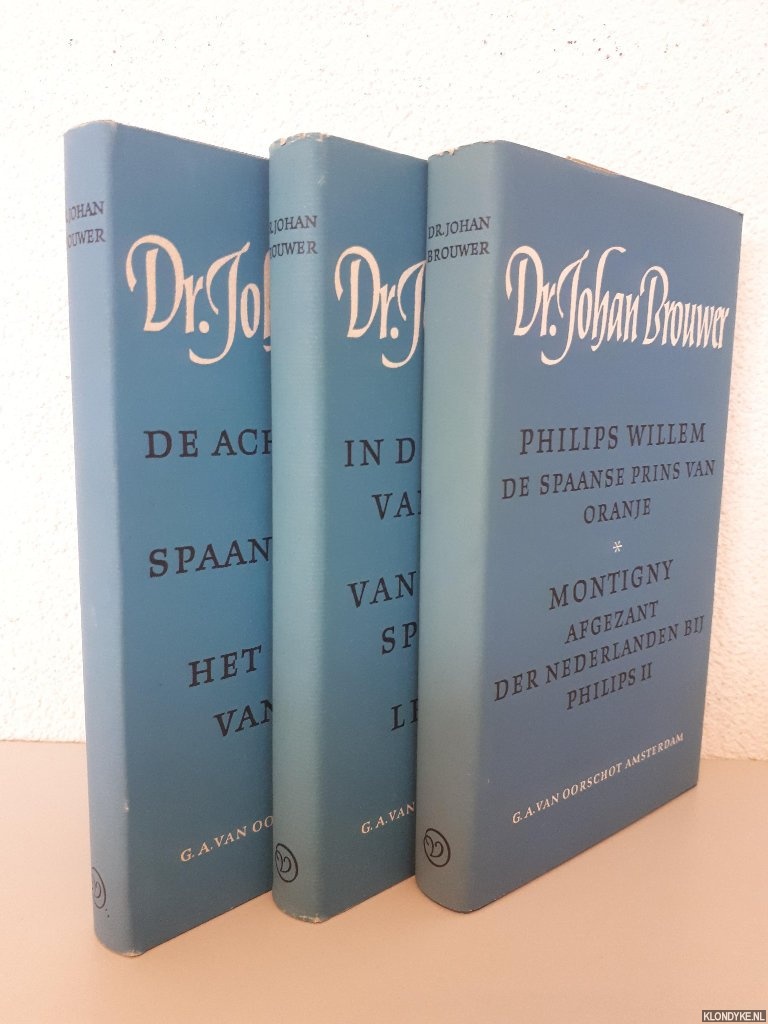 Beschrijving | 3 uniforme zwarte linnen banden met goudopdruk, stofomslagen, 608+563+535 pagina's, 8vo. Deel I) Philips Willem de Spaanse prins van Oranje; Montigny, afgezant der Nederlanden bij Philips II; Deel II) In de schaduw van de dood; Vandaag geen spreekuur; Legenden; Deel III) De achtergrond der Spaanse mystiek; Het mysterie van Spanje. |