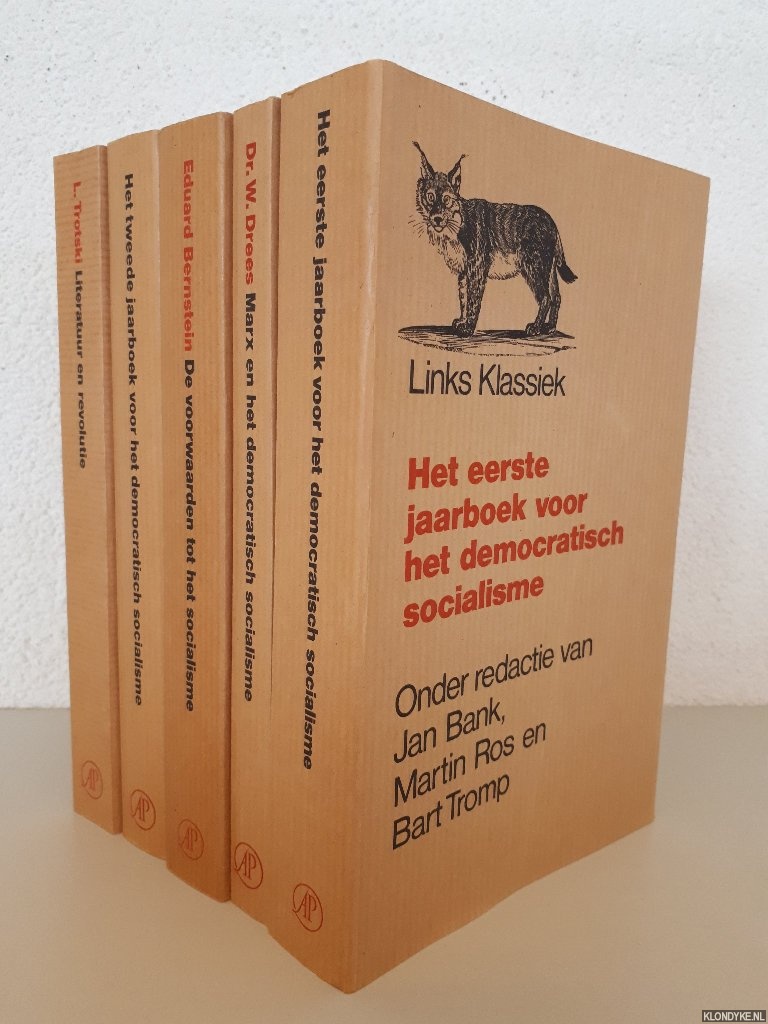 Beschrijving | 5 uniforme paperbacks, 364+189+308+267+287 pagina's, 8vo. 1) Jan Bank en anderen: Het eerste jaarboek voor het democratisch socialisme (ISBN 902952300x); 2) Dr. W. Drees: Marx en het democratisch socialisme: politiek-historische beschouwingen (9029513160); 3) Eduard Bernstein: De voorwaarden tot het socialisme en de taak der sociaal-democratie, (ISBN 9029501766; 4) Jan Banks en anderen: Het tweede jaarboek voor het democratiscj socialisme (ISBN 9029523018; 5) L. Trotski: Literatuur en revolutie (ISBN 9029549343). |