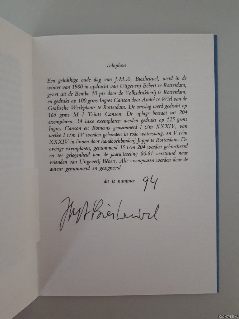 Beschrijving | Oorspronkelijk blind lichtblauw omslag in cahiersteek, softcover, stofomslag, oplage 204 genummerde en door de auteur gesigneerde exemplaren (dit is nummer 91), 8vo. |