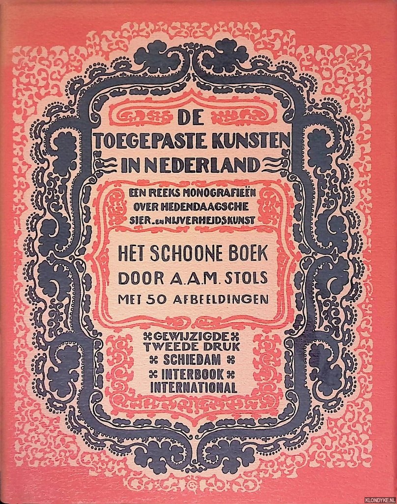 Beschrijving | Originele groene linnen band met goudopdruk, stofomslag, veel (paginagrote) illustraties in z/w, 8vo. De toegepaste kunsten in Nederland, een reeks monografieën over hedendaagsche sier- en nijverheidskunst, Het schoone boek, met 50 afbeeldingen. |
