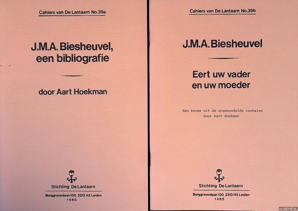 Beschrijving | 2 uniforme deeltjes met oorspronkelijke geniete omslagen, softcovers, fotografisch portret van J.M.A. Biesheuvel voorin beide delen, 55+43 pagina's, 8vo. Cahiers van De Lantaarn No. 39a en 39b. |