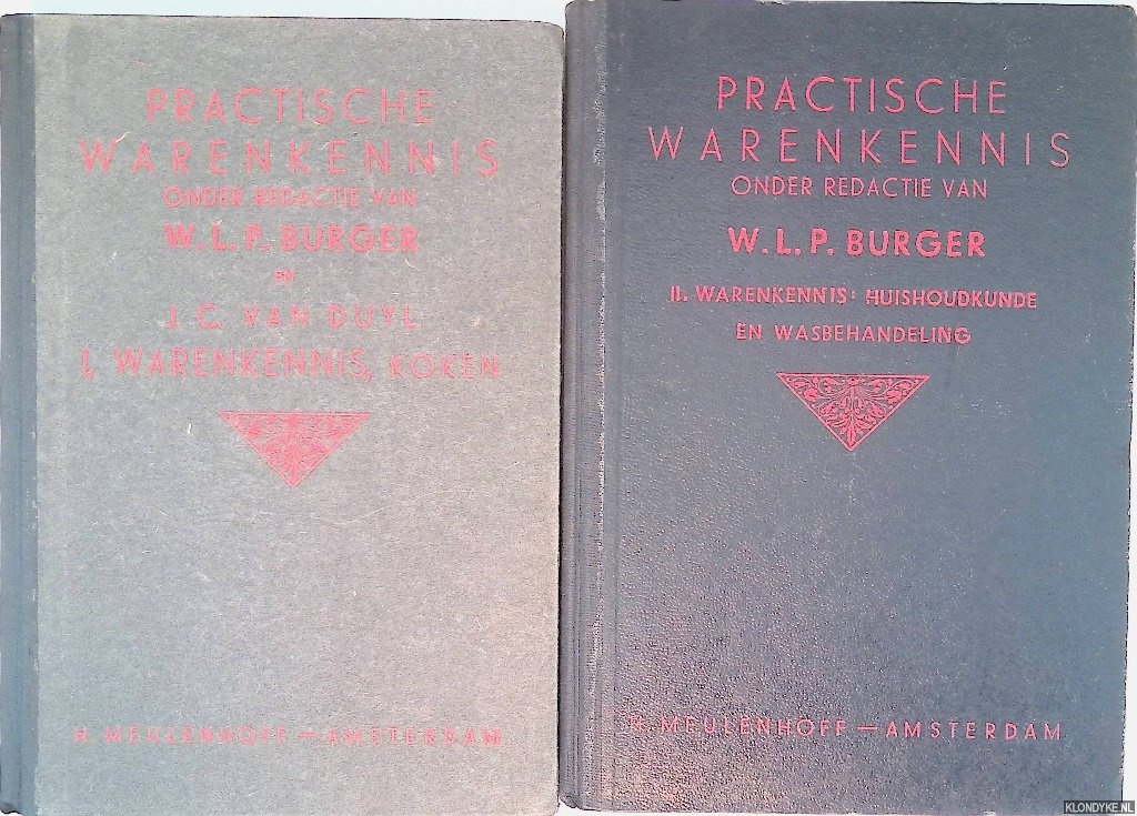 Beschrijving | 2 uniforme halflinnen banden, illustraties in z/w, 250+303 pages, 8vo. Deel I) Warenkennis, koken; Deel II) Warenkennis: huishoudlkunde en wasbehandeling. |