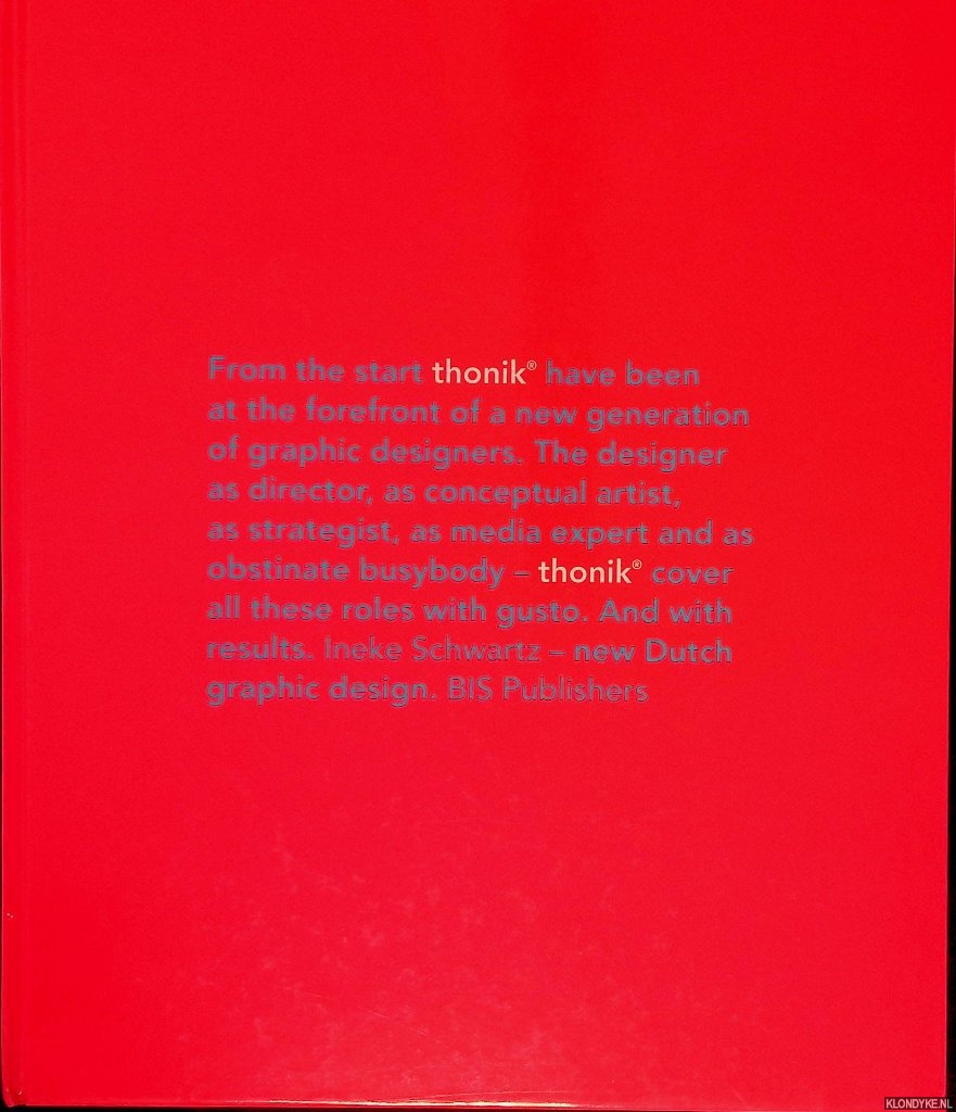 Samenvatting | First in a new series of monographs that will be devoted to the most successful young designers in the Netherlands. Thonik, formerly known as Gonnissen en Widdershoven, finds itself in the exclusive company of a group top Dutch design agencies that have been able to attract attention and acclaim from their international peers. Thonik's style is not easily defined but it could be said that their designs are deceptively simple. In each work, underlying a minimum of graphic devices, is a hidden expressive gesture that brings agility and cheek to conceptual precision. In 1998 they won an award from ID Magazine for a book they designed titled "Eternally Yours," the subject of which was sustainable product development. In an environment where so much loud shouting is required to captur... (Lees verder)e public attention the work of Thonik provides welcome relief. |