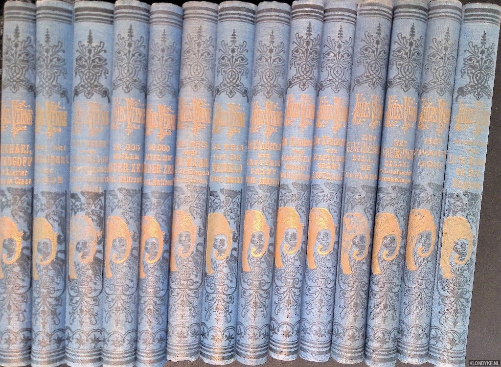 Beschrijving | 14 uniforme delen uit de blauwe bandjesserie, illustrarties in z/w, verschillende drukken en jaren van uitgave, 8vo.Het gaat om de volgende delen: 1) De reis om de wereld in 80 dagen; 2) De reis naar de maan in 28 dagen en 12 uren; 3-4) 20.000 mijlen onder zee (2 delen); 5) Vijf weken in een luchtballon: ontdekkingsreis in de Binnenlanden van Afrika; 6) Naar het middelpunt der aarde; 7) Michael Strogoff: De Koerier van de Czaar; 8) Avonturen van drie Russen en drie Engelsen gevolgd door De Blokkadebreker; 9) Het zwarte goud; 10-11) Het geheimzinnige eiland (2 delen); 12-14) De kinderen van Kapitein Grant (3 delen). |