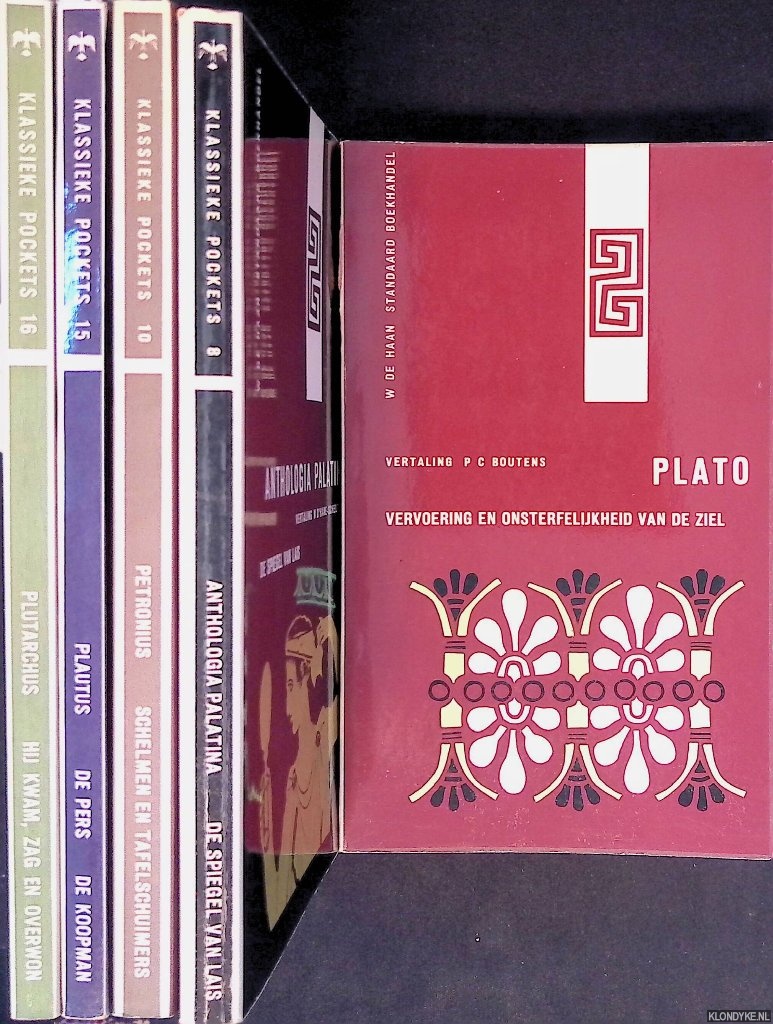 Beschrijving | 5 uniforme pockets uit de serie Phoenix Klassieke Pockets, illustraties in z/w, verschillende drukken en jaren van uitgave, 8vo. Het gaat om de volgende delen: 1) 4: Plato: Vervoering en onsterfelijkheid van de ziel; 2) 8: Anthologia Palatina; De spiegel van Lais; 3) 10: Petronus: Schelmen en tafelschuimers; 4) 15: Plautus: De Pers; De Koopman; 5) 16: Plutarchus: Hij kwam, zag en overwon. |