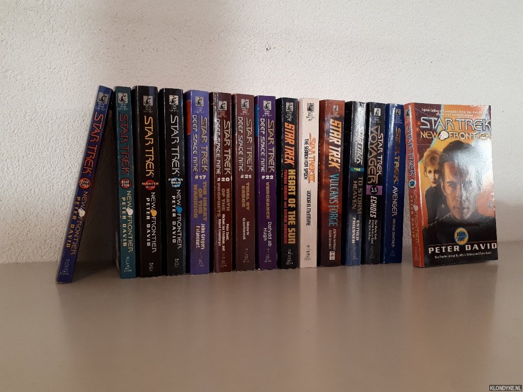 15 pockets, 8vo. 1) Star Trek New Frontier: Into The Void (book 2); 2) Star Trek New Frontier: The Two Front War (book 3); 3) Star Trek New Frontier: End Game (Book 4); 4) Star Trek New Frontier: Martyr (Book 5); 5) Star Trek New Frontier: Fire on High (book 6); 6) Star Trek Deep Space Nine: The Heart of the Warrior; 7) Star Trek Deep Space Nine: Wrath of the Prophets; 8) Star Trek Deep Space Nine: Trial by Error; 9) Star Trek Deep Space Nine: Vengeance; 10) Star Trek Avenger; 11) Star Trek Voyager: Echoes; 12) Star Trek The Next Generation: To Storm Heaven; 13) Star Trek Vulcan's Forge; 14) Star Trek III: The Seach for Spock; 15) Star Trek Heart of the Sun.