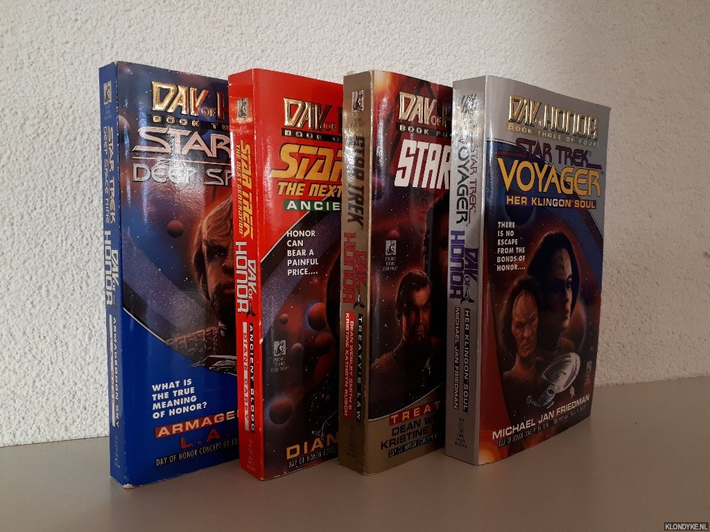 Beschrijving | Complete set of 4 pockets,280+277+275+279 pages, 8vo. Book one of four) Ancient Blood; Two of four) Treaty's Law; Three of four) Her Klingon Soul; Four of four) Ermageddon Sky. |