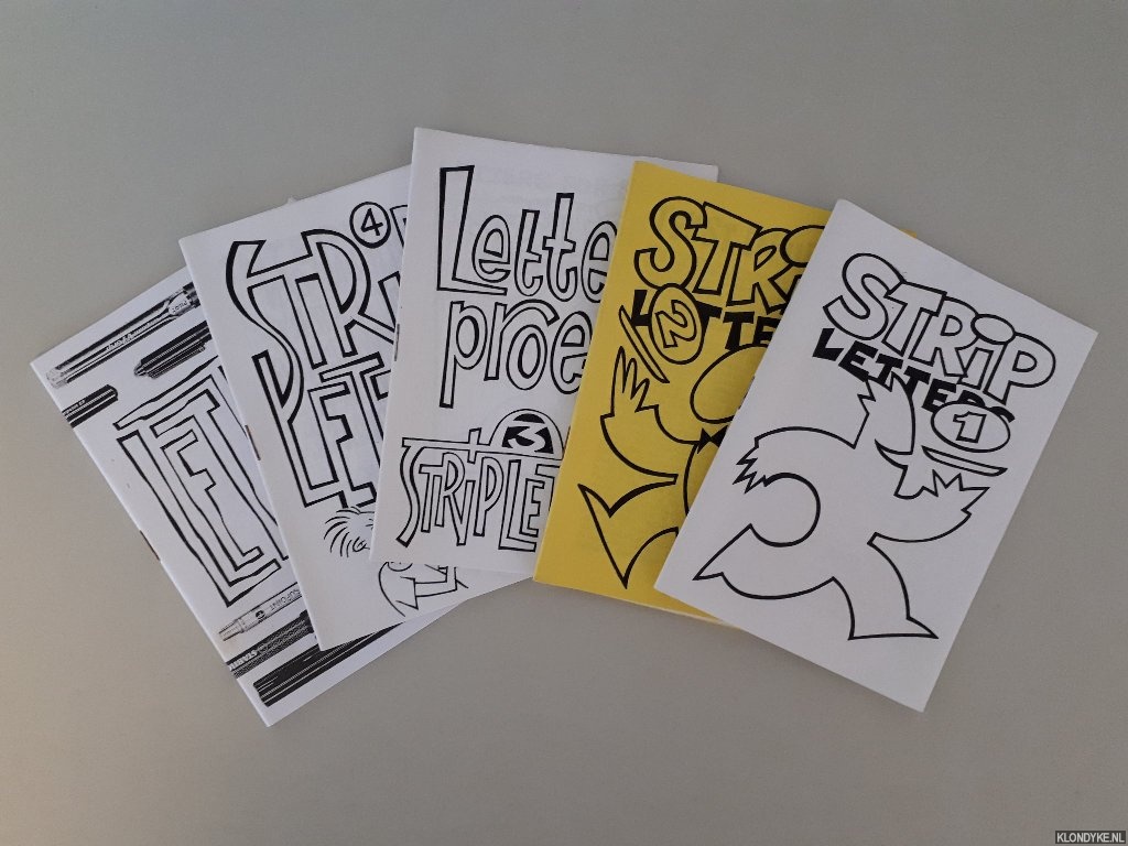 Beschrijving | 5 uniforme geniete boekjes, 4x Stripletters (aflevering 1-4) en 1x Letters, illustraties in z/w, klein 8vo. |