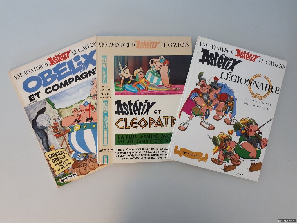 Beschrijving | 3 volumes with original pictorial boards, comics in colour, various years of publication, reprints, 4to. 1) Astérix légionnaire; 2) Astérix et Cleopatre; 3) Obélix et compagnie. |